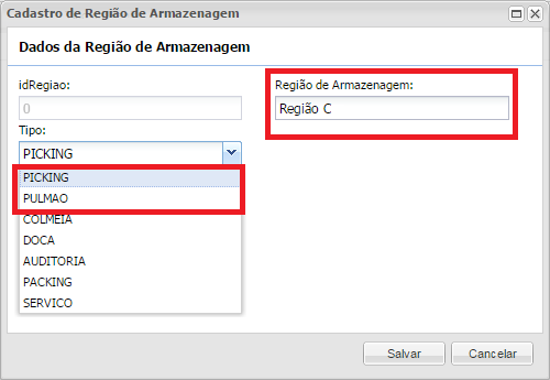 - Região de Armazenagem: Faz referência ao nome da Região de Armazenagem.