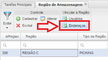 - Botão Endereço: Associará os Endereços a Região de Armazenagem, que por sua vez representarão ou Pulmão, ou Picking, ou Doca, ou Packing, ou Colmeia, ou Auditoria, ou Serviço.
