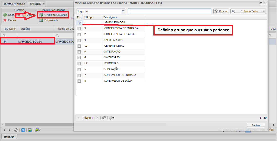 Definir o Grupo de Usuários: Selecionar usuário(s) e clicando no botão GRUPO DE USUÁRIOS na tela de Cadastro de Usuário