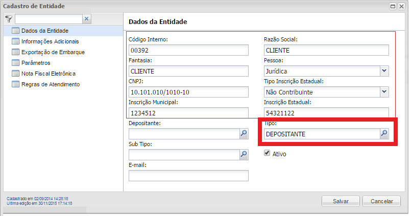 Preencher os campos obrigatórios destacados. Para criar um Depositante, setar o Tipo da Entidade para DEPOSITANTE conforme imagem: