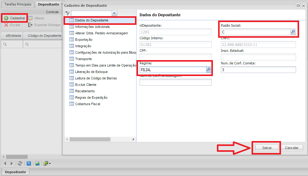 - Clicar no botão Cadastrar, na tela do Cadastro preencher os campos obrigatórios destacados, no campo Razão Social clicar na lupa ao lado do campo Razão Social, irá abrir a pesquisa para selecionar a Razão Social cadastrada no Cadastro de Entidade do tipo Depositante, após selecionar a Razão Social deverá ser realizado o cadastro do Regime (Filial ou Armazém Geral) clicando na lupa ao lado do campo Regime irá abrir a pesquisa para selecionar o regime do Depositante.