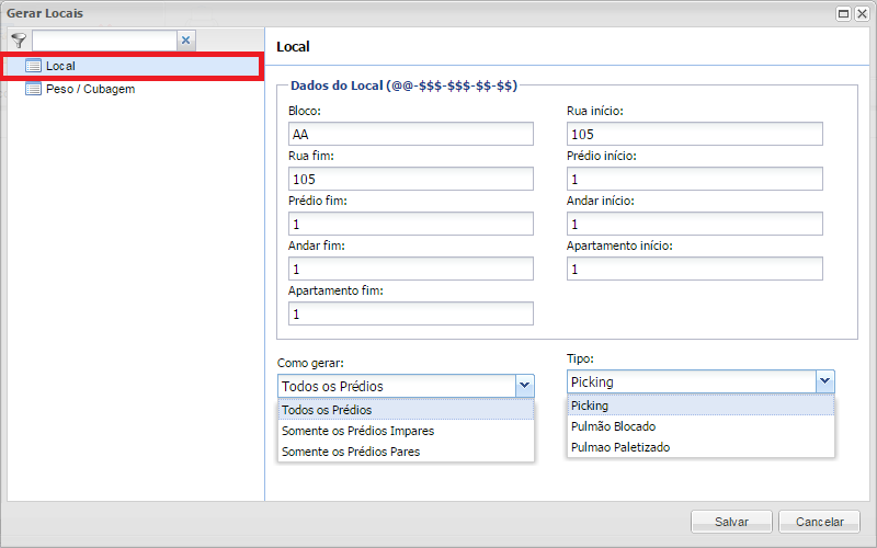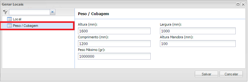 Ainda na tela Gerar Locais / Sub Menu Peso / Cubagem, cadastrar a: