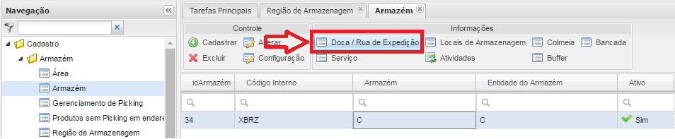 Menu: Cadastro / Armazém / Armazém, selecionar o Armazém e clicar no botão Doca / Rua de Expedição.