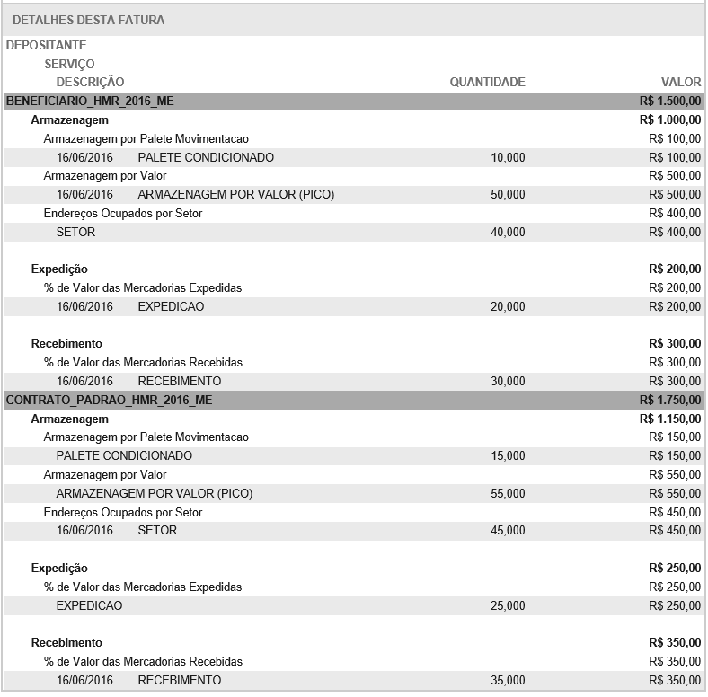 Foi alterado o Relatório da Fatura dos Serviços, onde foi inserido Resumo de Cobrança por Depositante logo abaixo do Resumo da Fatura e antes dos detalhes da fatura, sobre os Detalhes da Fatura os valores serão agrupados por depositante.