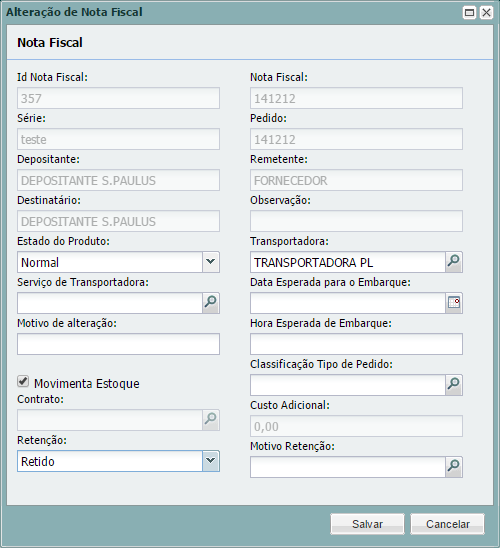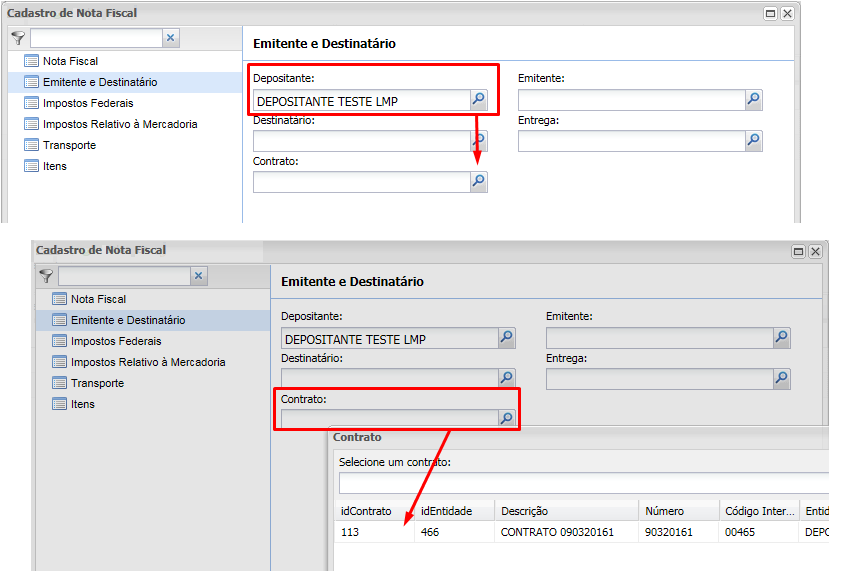 Foi adicionado o campo Contrato na digitação do Cabeçalho da Nota Fiscal, que vinculará a Cobrança dos Serviços de Armazenagem. Somente poderá existir um contrato por Nota Fiscal do Tipo Entrada, e listará somente os contratos ativos que estejam vinculados ao depositante de Nota Fiscal ou a entidade pagadora, desde que estes contratos não estejam cancelados e ou finalizados.
