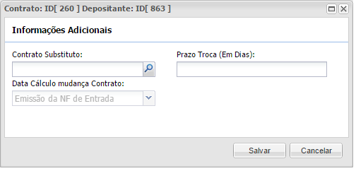 - Permitirá definir prazo em dias para troca do contrato para cada depositante associado ao contrato. A troca de um contrato será realizada após o período especificado, apenas quando esse campo estiver preenchido com valor superior a zero, e apenas para os lotes de armazenagem que tiveram sua origem amarrada ao contrato pai, transferindo para o contrato substituto o ônus das operações pertinentes a esse lote a partir desse momento como por exemplo as tarifas de armazenagem e expedição que envolverem os lotes modificados.