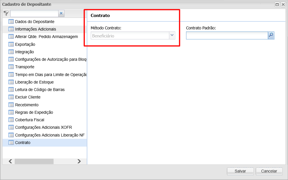 - Contrato Padrão: Selecionará um dos contratos vinculados ao depositante ou ao campo Entidade Pagadora.