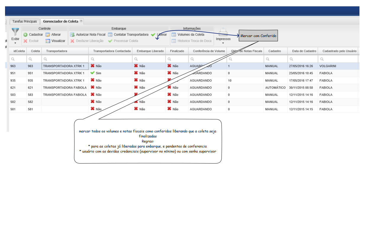 Inserido botão Marcar como Conferido : cuja funcionalidade será de marcar os volumes das coletas como conferido.