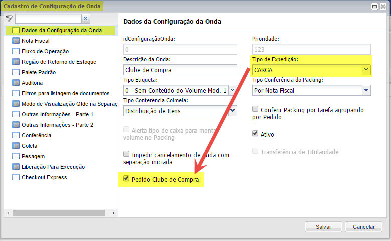 - A Configuração da Onda ser do Tipo de Expedição: Carga.
