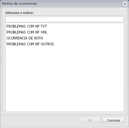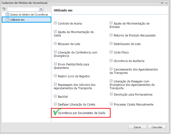 - Motivo: Escolher descrição que foi previamente cadastrada no cadastro de Motivo de Ocorrência, desde que esta esteja ativada a opção “Ocorrência por Documento de Saída”.