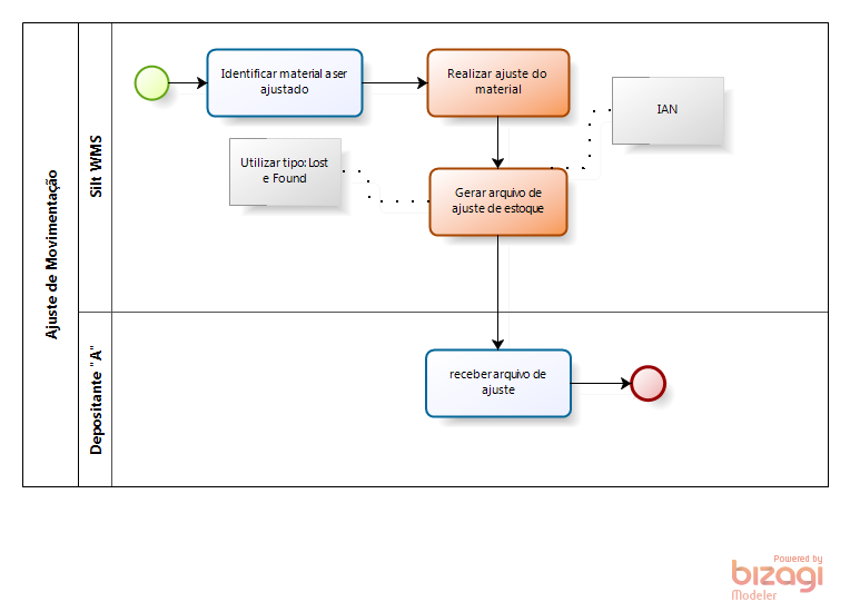 Ajuste de Movimentação de Estoque, no WMS será realizado a atividade de Ajuste de Material, ao confirmar o Ajuste de Entrada ou Saída, será gerado o arquivo IAN no diretório Exportação para o ERP, que atualizará a base com as quantidades enviadas pelo WMS.