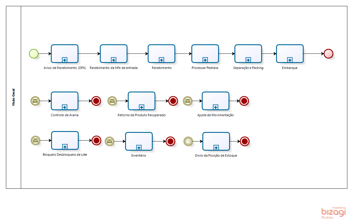 Exibe de modo sintético o fluxo da operação do armazém, onde existirá uma entrada Aviso de Recebimento(OPA) → Recebimento da NF-e de entrada -> Recebimento de Ordem de Recebimento -> Importação de Nota de Saída -> Liberação de Nota para Roteirizar havendo o Formação de Onda com os pedidos envolvidos -> Separação das Embalagens dos diversos endereços do pulmão / picking -> Conferência das embalagens que tiveram os volumes montados -> Direcionados os volumes para o Embarque para a transportadora.