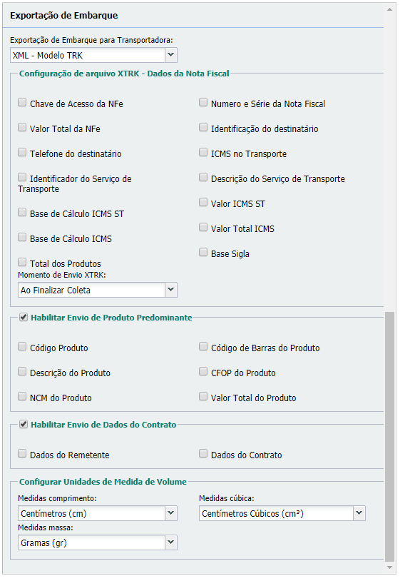 - Embarque para Transportadora: Define se gerará exportação para transportadora no momento em que processar a coleta: