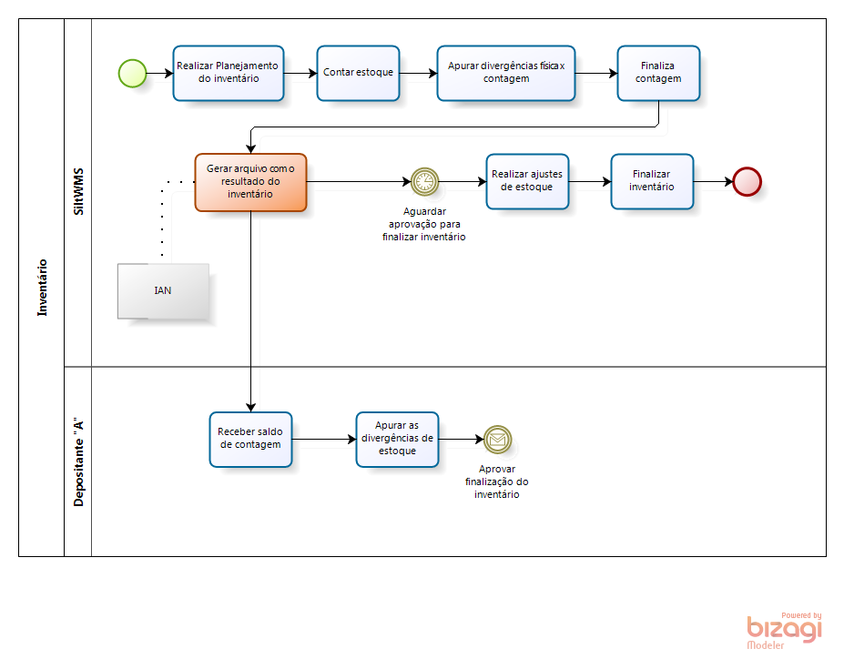 Ajuste de Estoque Inventário Geral, será realizado o Planejamento do Inventário, iniciado a contagem de estoque. Haverá o gerenciamento do inventário apurando as divergências física versus a contagem realizada. Após apurar todas as divergências, será possível Finalizar a Contagem e o sistema irá gerar arquivo IAN no diretório Exportação para avaliação do ERP para apurar divergências de estoque, enquanto isso no WMS precisará aguardar aprovação do ERP (processo manual, isto é, alguém responsável pelo WMS entrará em contato com o ERP para solicitar autorização/aprovação pra continuar com o processo de atualização do inventário) , após a confirmação irá finalizar inventário, realizando ajuste dos materiais no estoque do WMS, portanto concluindo o inventário.