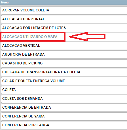 Acessar o Menu do coletor ALOCAÇÃOUTILIZANDOMAPA.