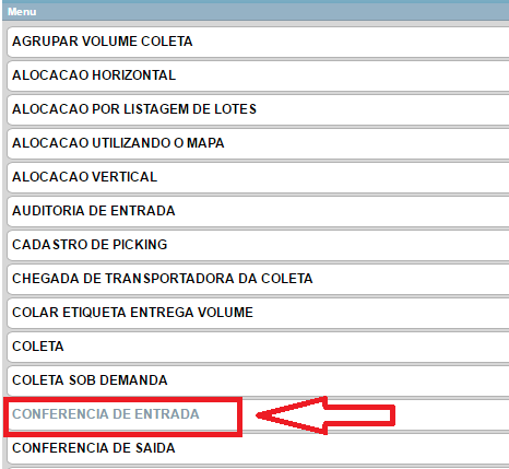 Acessar o menu CONFERÊNCIA DE ENTRADA do coletor de dados, para realizar a Conferencia de Entrada dos componentes do PRODUTOKIT que está sendo desmontado.