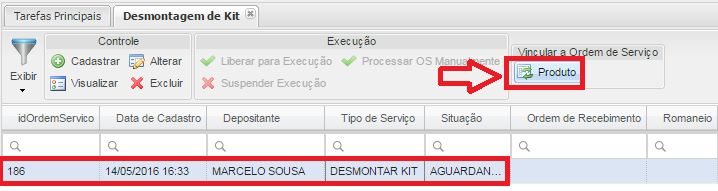 Após realizar o cadastro, clicar no botão PRODUTO para vincular o produto Kit que será desmontado.