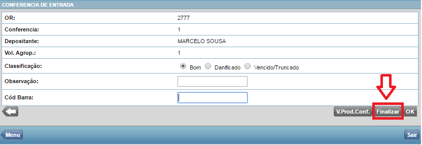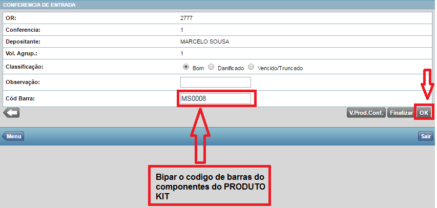 Na tela de CONFERÊNCIA DE ENTRADA digitar o número da O.R gerada na desmontagem de kit e clicar no botão OK.