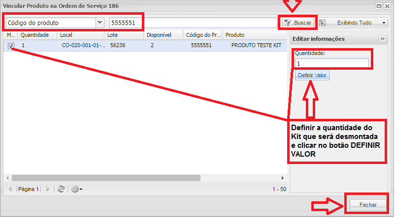 Realizar o filtro do PRODUTOKIT que será desmontado, em seguida selecioná-lo, definir a quantidade a ser desmontada e clicar no botão DEFINIRVALOR. Após definido o valor clicar no botão FECHAR.