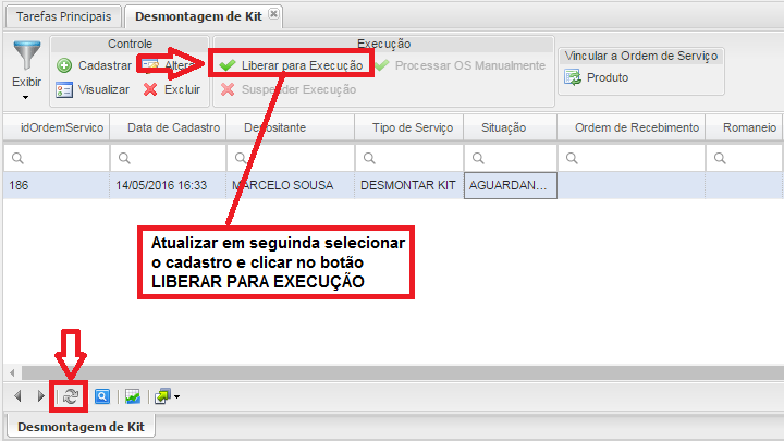 Após vincular os produtos Kit, clicar no botão para atualizar a tela, e em seguida clicar no botão LIBERARPARAEXECUÇÃO.