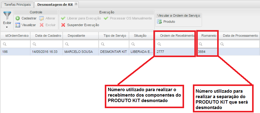 - Após a conclusão da Separação e Conferência de Saída do Romaneio, será criado o número da O.R, que realizará o recebimento dos componentes do PRODUTOKIT no Armazém.