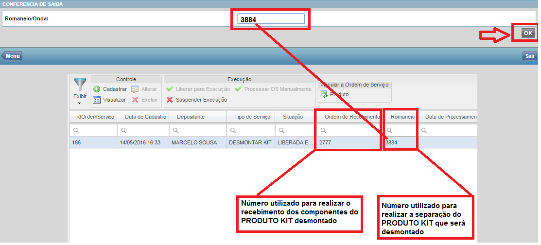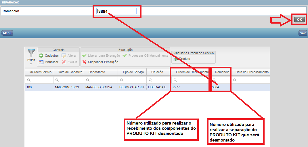 Na tela de SEPARAÇÃO digitar o número da separação gerada na desmontagem de kit e clicar no botão OK.