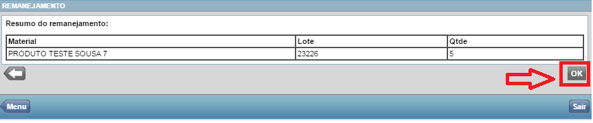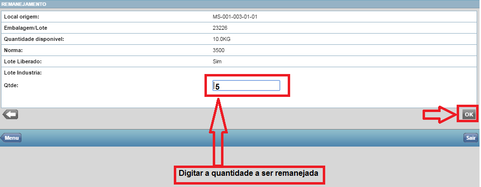 Digitar a quantidade a ser remanejada, em seguida clicar no botão OK.