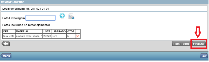 Para concluir o remanejamento, clicar no botão FINALIZAR.