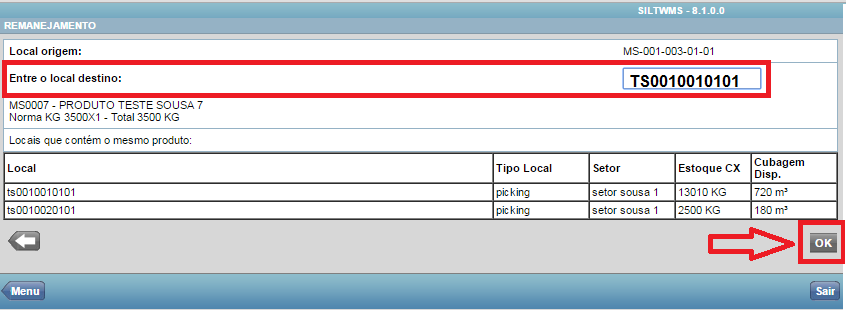 Após bipar o produto, confirmar o LOCAL DE DESTINO (novo local onde será armazenado o produto), indicado no Coletor de Dados.