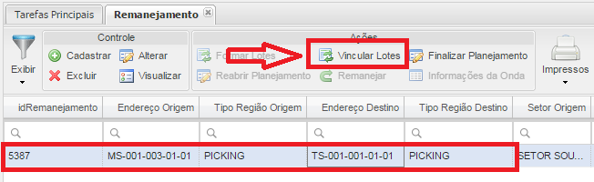 Após realizar o cadastro do remanejamento, selecionar o registro e clicar no botão VINCULARLOTES.