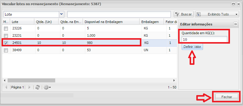 Na tela de VINCULARLOTES, selecionar o lote e informar a quantidade a ser remanejada do produto de acordo com a quantidade disponível.
