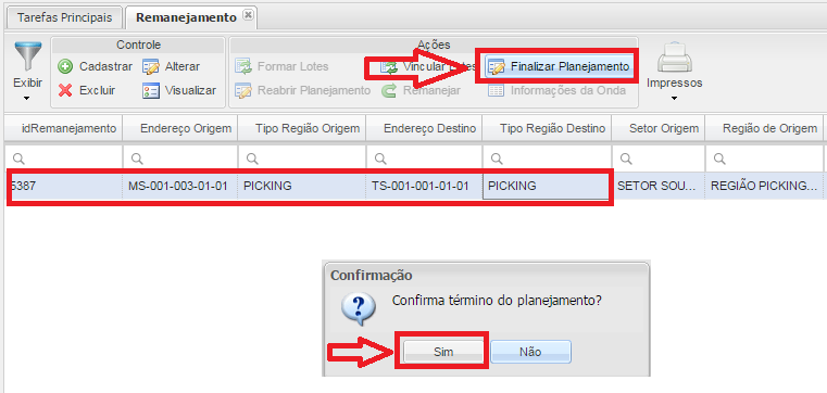 Clicar no botão FINALIZARREMANEJAMENTO e confirmar SIM, para finalizar o planejamento do remanejamento.