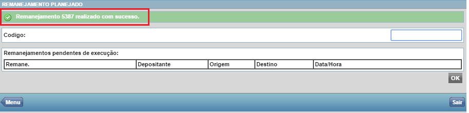 Exibirá a tela com um resumo do que será remanejado. Clicar no botão OK.
