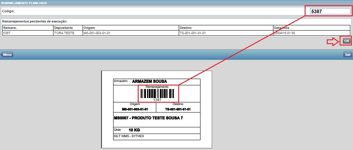 Na Tela de Remanejamento Planejado bipar o Código de barras da etiqueta de remanejamento.