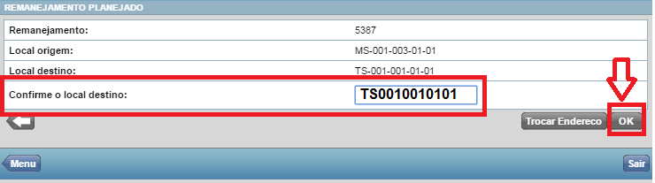 Bipar no local onde o produto será remanejado, LOCALDESTINO.