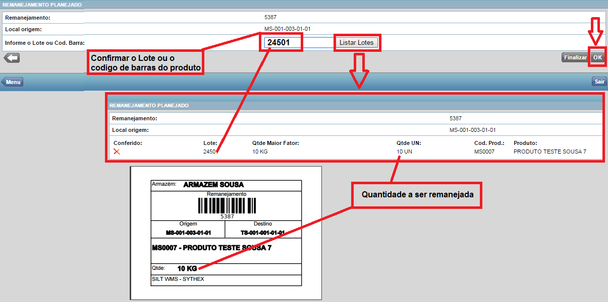 Bipar Lote de Armazenagem ou Código de Barras (embalagem) do produto a ser remanejado.