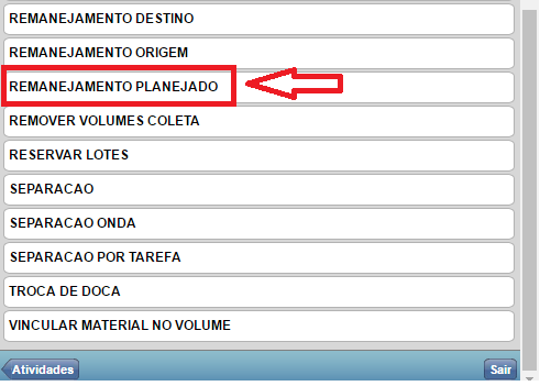 Acessar o Coletor de Dados, menu REMANEJAMENTOPLANEJADO.