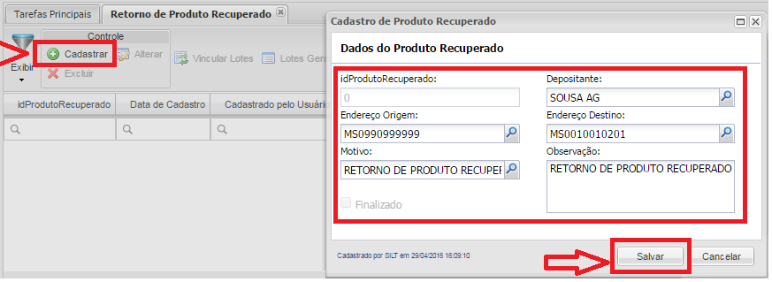 Clicar no botão CADASTRAR, alimentar os campos destacados e clicar no botão SALVAR.