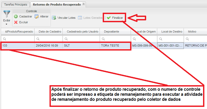 Após vincular os lotes, selecionar o cadastro de retorno de produto recuperado e clicar no botão FINALIZAR, para finalizar o planejamento do RETORNO DE PRODUTORECUPERADO.
