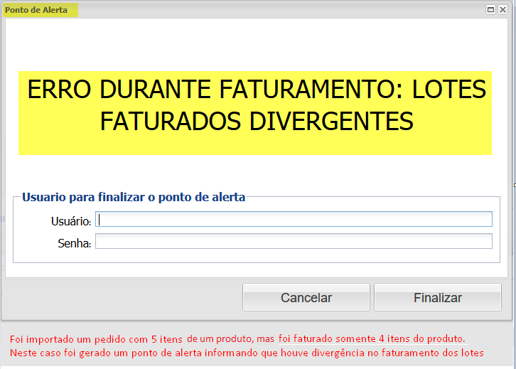 Exibirá Ponto de Alerta, se existir divergência de Lote Indústria ou de quantidade.