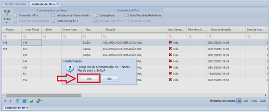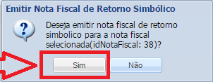 Após clicar no botão SIM a NF de Retorno Simbólico será gerada, e para realizar a transmissão da Nota Fiscal para Sefaz acessar o tópico Transmissão NFe – Pedido Retorno e Retorno Simbólico de Armazenagem deste documento.