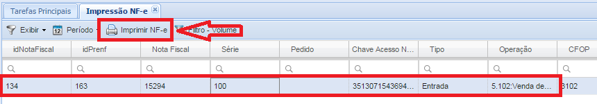 Selecionar a Nota Fiscal e clicar no botão IMPRIMIR NF-e.