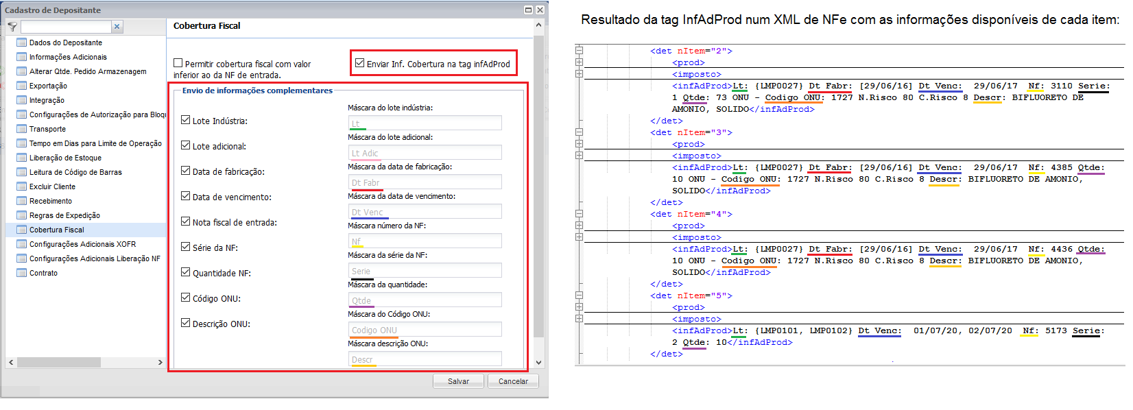 Será gerada a NF de Retorno de Armazenagem, conforme Cadastro de Depositante para o qual foi possui todas as opções de personalização da tag < infAdProd > que estiverem marcadas e serão enviados os dados conforme personalização do grupo “Envio de informações complementares”.