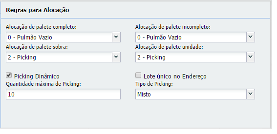 Quando o tipo de endereço for Todos ou Picking, poderemos configurar o parâmetro Permitir Picking.