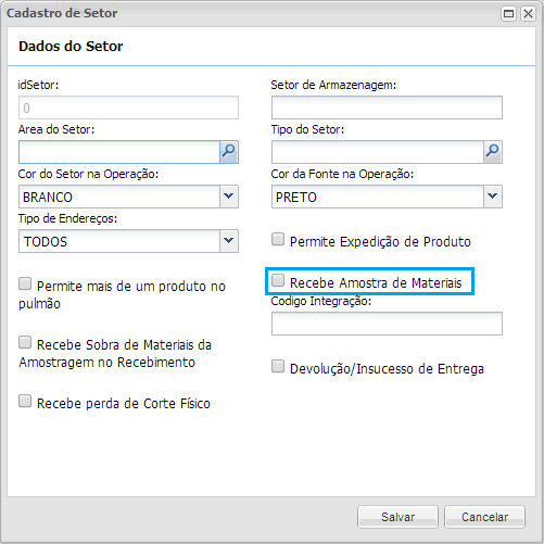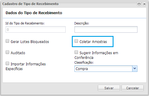 No Cadastro do Tipo de Recebimento, que será vinculado ao Cadastro de Recebimento, se marcar o parâmetro “Coletar Amostra”, será necessário que exista ao menos um setor, no Cadastro de Setor que receba amostras e que tenha vínculo com produtos, locais, região de armazenagem.