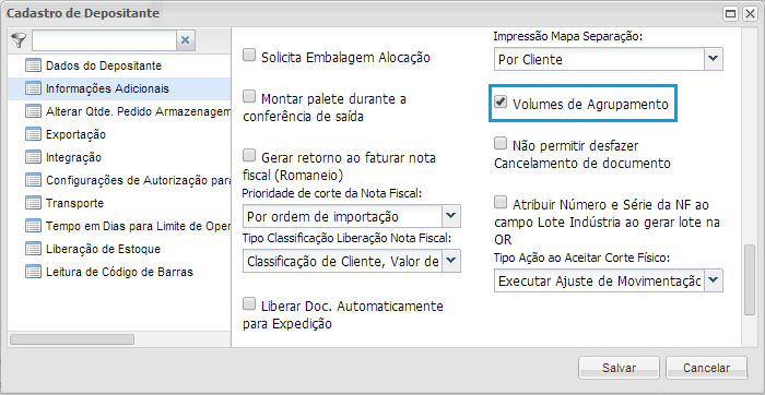 Parâmetro “Volume de Agrupamento” ativado na Configuração do Depositante / Informações Adicionais