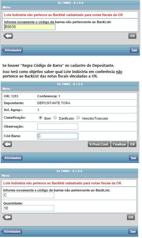 - O backlist do lote indústria deverá ser único, ou seja, não poderá existir mais de um backlist cadastrado para o mesmo lote indústria, pois não seria possível carregar a quantidade corretamente. Esta regra será usada apenas na Conferência da Ordem de Recebimento. O cadastro de backlist não poderá ser alterado, podendo sim ter backlist duplicado. Caso isto ocorra o sistema desempatará buscando o backlist solicitando a quantidade, com uma mensagem deixando claro o motivo da solicitação da quantidade.