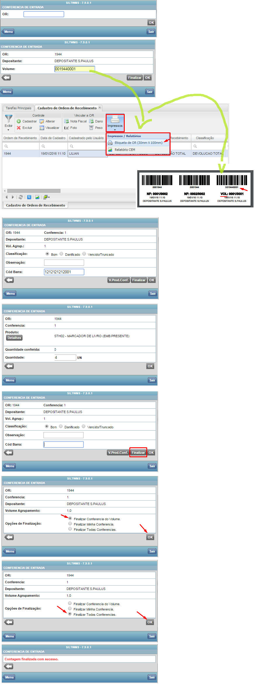 - A etiqueta de volumes será impressa na tela Cadastro / Entrada / Cadastro de Ordem de Recebimento / localizar registro / botão Impressos / Etiqueta de OR