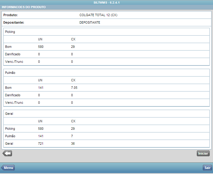 Na janela Estoque Sintético é apresentado a contagem de produtos por Picking, Pulmão e Geral, separando pelo Tipo Bom, Danificado, Vencido / Truncado, por embalagem unitária e por caixa.
