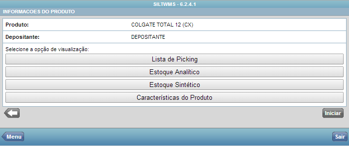 Nesta tela o usuário terá a possibilidade de escolher entre as opções de “Lista de Picking”, “Estoque Analítico”, “Estoque Sintético” e “Características do Produto”.